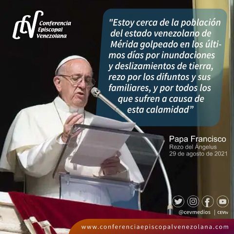 El Papa Francisco durante el Ángelus de hoy domingo 29 de agosto de 2021 expresó palabras de solidaridad a la población del Estado Mérida (Venezuela) por la calamidad sufrida por las inundaciones: