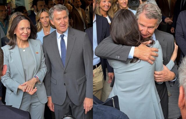 Al recibirla con un abrazo y dos besos, Feijóo exclamó ante los medios y simpatizantes sobre a la líder opositora: «Valiente».