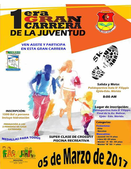Para este domingo cinco de marzo, se tiene previsto la realización de la 1era gran Carrera de la juventud en la ciudad de Ejido, organizada por el Instituto de Deporte y el Instituto de la Familia de la localidad, así lo dio a conocer Angélica Quintero, directora de la institución deportiva.